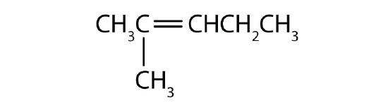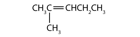 - La chaîne la plus longue contenant la double liaison a cinq atomes de carbone, donc le composé parent est un pentène (règle 1). Pour donner au premier atome de carbone de la double liaison le plus petit nombre (règle 2), on numérote à partir de la gauche, le composé est donc un 2-pentène. Il y a un groupe méthyle sur le troisième atome de carbone (règle 3), le nom du composé est donc 3-méthyl-2-pentène.