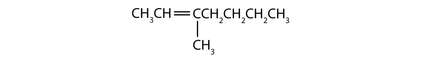 - La chaîne la plus longue contenant la double liaison possède cinq atomes de carbone, le composé est donc un pentène (règle 1). Pour donner au premier atome de carbone de la double liaison le numéro le plus bas (règle 2), on numérote à partir de la gauche, le composé est donc un 2-pentène. Il y a un groupe méthyle sur le quatrième atome de carbone (règle 3), donc le nom du composé est 4-méthyl-2-pentène.