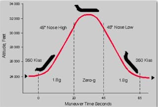 A forma da trajectória de voo de vómito-cómetro chama-se uma parábola. Os pilotos conseguem isto voando para cima num ângulo de cerca de 45 graus e depois nivelam e mergulham a cerca de 45 graus, o que cria a aceleração necessária para cancelar a gravidade. A velocidade máxima para o avião e a rapidez com que o avião pode puxar para cima antes e depois de uma parábola determinam quanto tempo esta aceleração pode durar, cerca de 25 segundos.