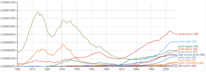 Numa peça sobre a etimologia do baile de finalistas, Slate apresentava este gráfico fixe extraído do Google Books Ngram Viewer que traça a prevalência da terminologia relacionada com o baile desde 1900. Interessante notar o pronunciado mergulho em todas as referências ao baile de finalistas ao longo dos anos 60 e 70 – talvez, como infere o artigo, devido às exigentes questões culturais e políticas da época, como a Guerra do Vietnã e o movimento anti-estabelecimento.